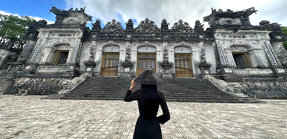 สุสานจักรพรรดิไคดิ่ง (Lăng Khải Định) - เป็นสถาปัตยกรรมที่ผสมผสานระหว่างตะวันตกและตะวันออกอย่างลงตัว ตั้งอยู่ท่ามกลางธรรมชาติที่สวยงาม เต็มไปด้วยภาพจิตรกรรมกระเบื้องที่มีความละเอียดอ่อนและอลังการ